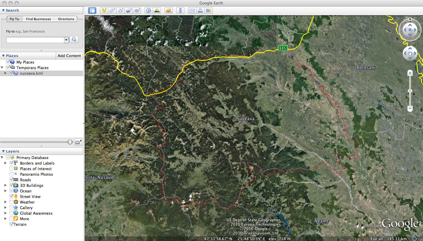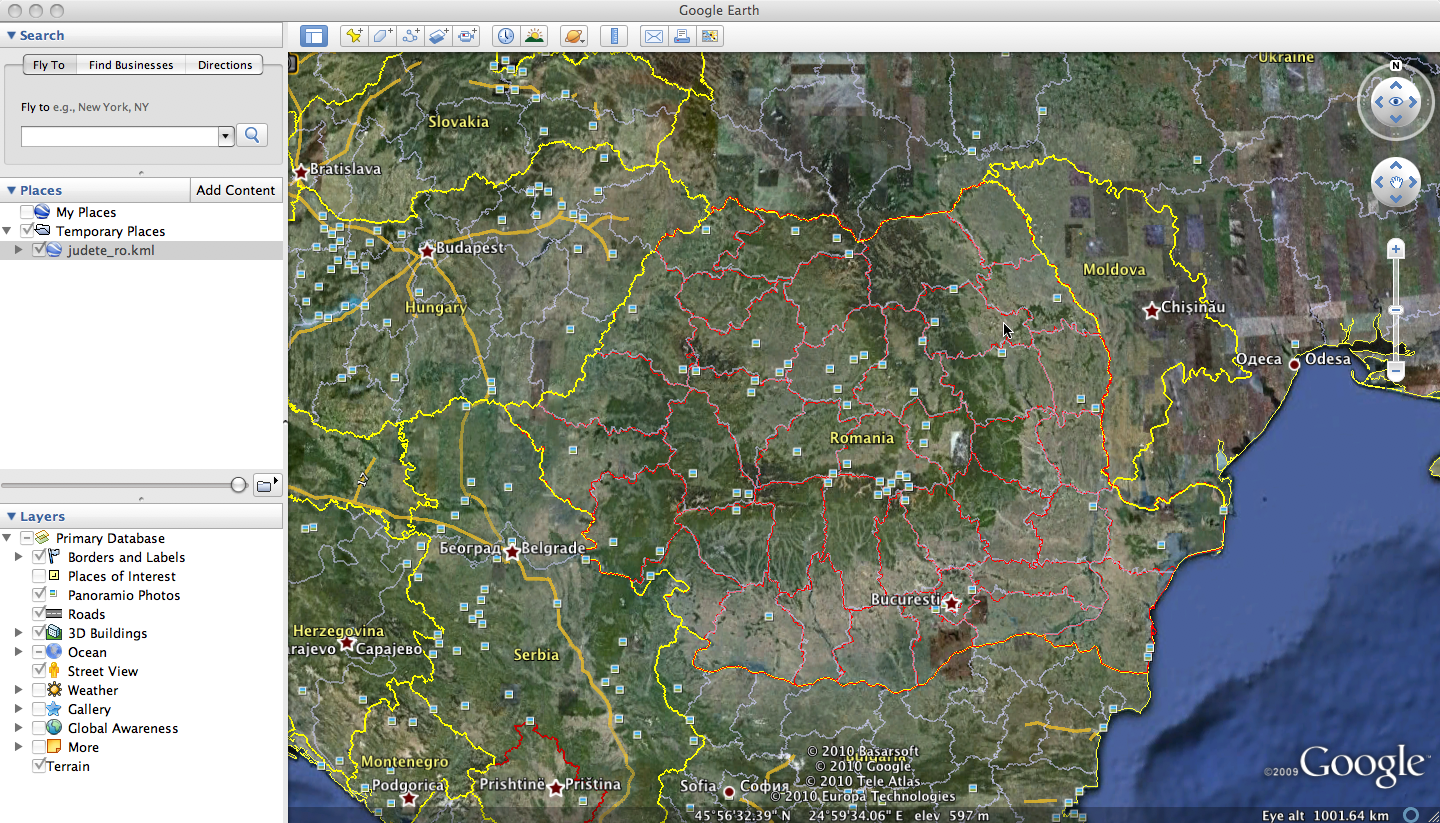 Dacă totul a funcționat corect, rezultatul în Google Earth ar trebui să fie similar cu cel din Figura 1 (limitele de județe sînt reprezentate cu roșu).