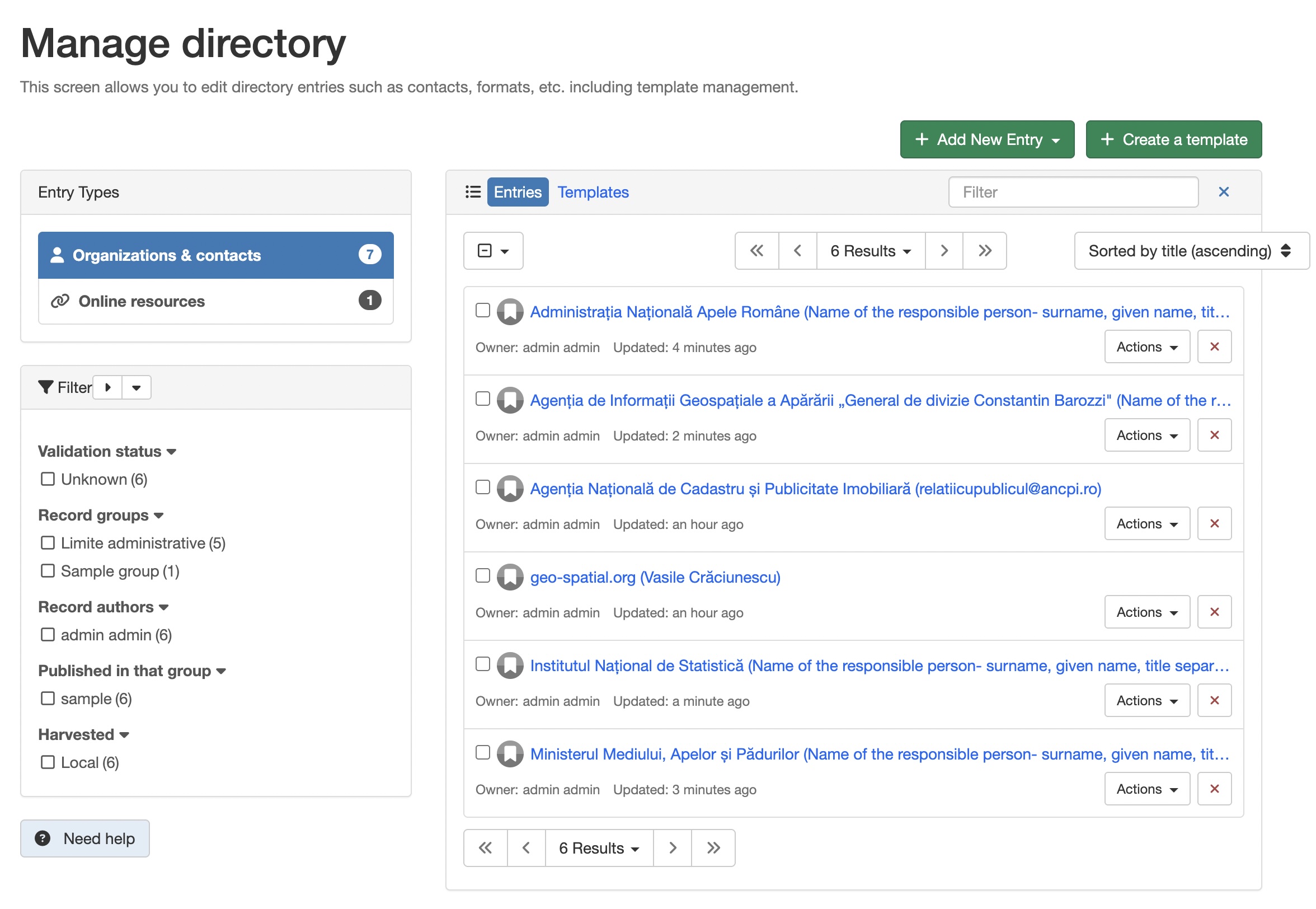 Pentru a ușura munca de completare a acestei secțiuni, GeoNetwork oferă posibilitatea definirii unui registru de organizații/contacte. Catalogul geo-spatial.org are deja o serie de organizații definite. Accestea pot fi accesate folosind Add contact. Organizații noi se pot adăuga folosind meniul Contribute/Manage directory.